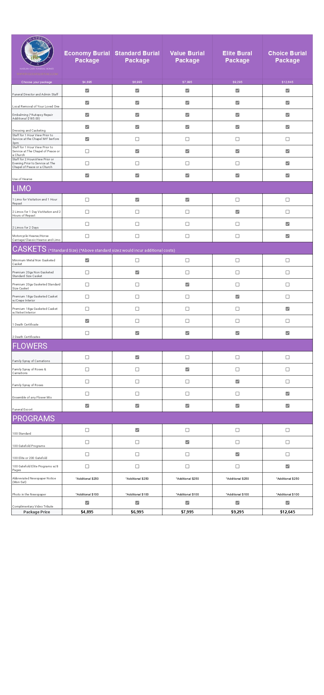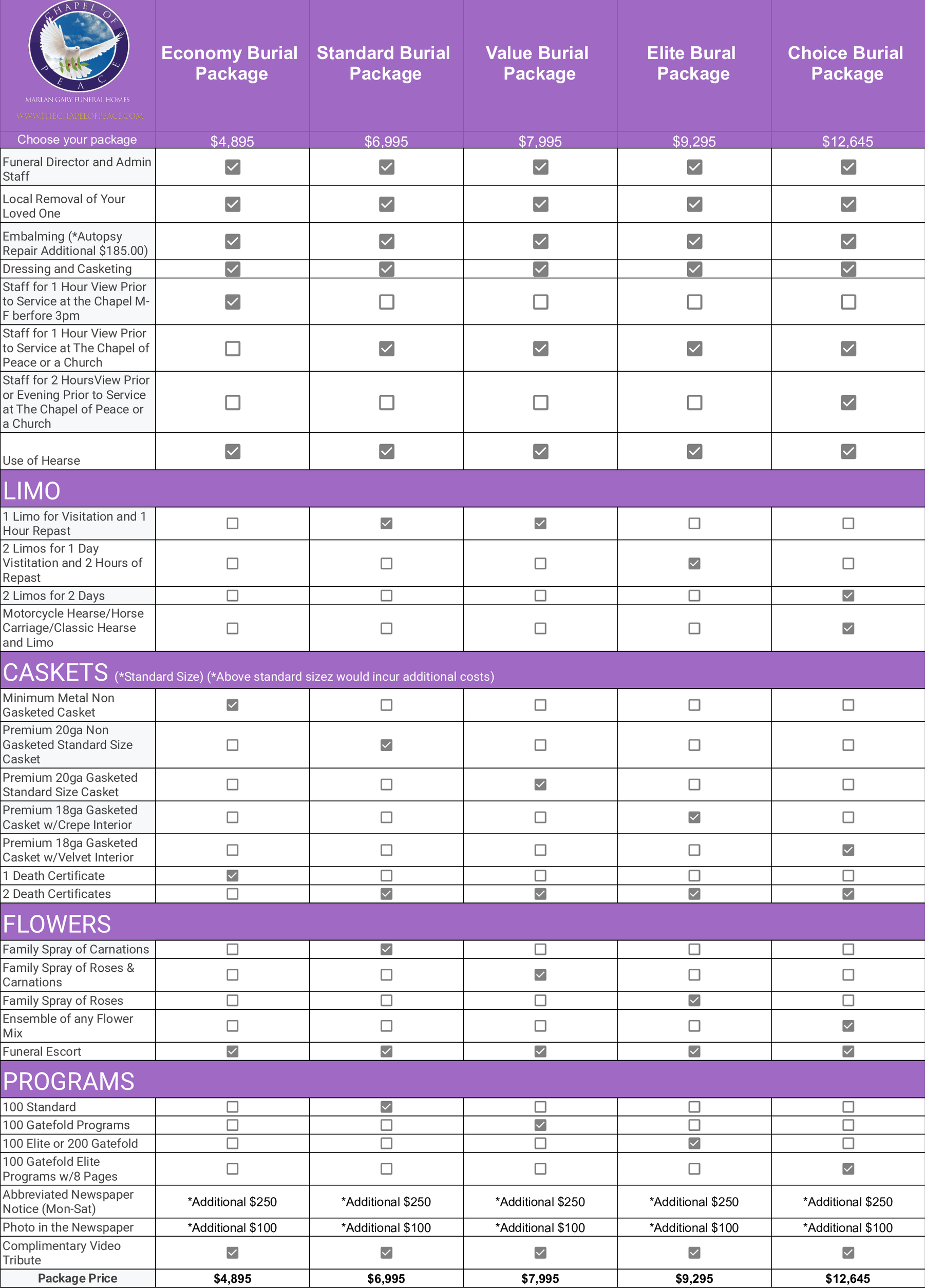 The prices shown on this page are discounted from our traditional prices and packaged to give you the items and services needed for a complete service. If you wish not to use a package you can then choose services line by line from our general price list. We do not allow any substitutions on the packages except the outside charges. If you purchase your casket from another vendor, these packages will not be available, again you would choose services line by line from the general price list.
