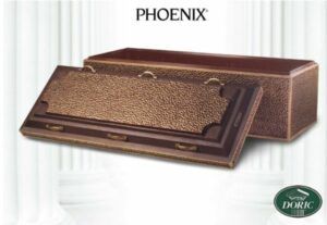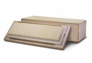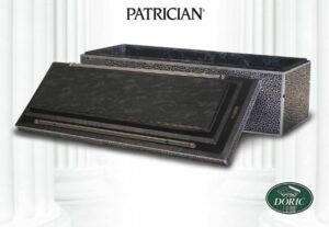 2400 lbs. (Box 1550/Cover 850) – A concrete burial vault completely reinforced with steel and fibermesh, with a grooved marble-like ABS liner and carapace with symbolic wheat and Greek key designs. One piece cover with two bar handles, sealed with flexible butyl resin sealant. Exterior painted in white with gold highlights.